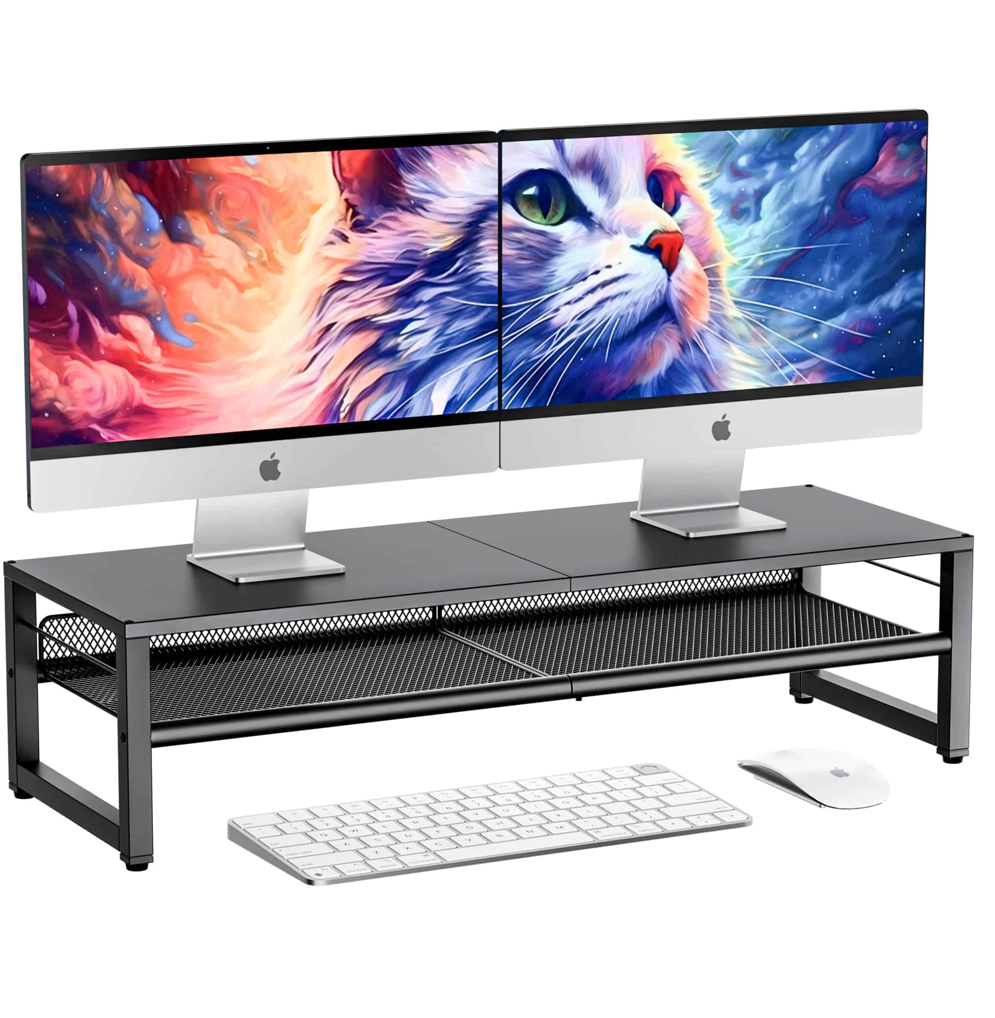 You should buy this 2-tier dual monitor stand because it combines workspace organization with ergonomic design to reduce desk clutter while supporting two monitors.
