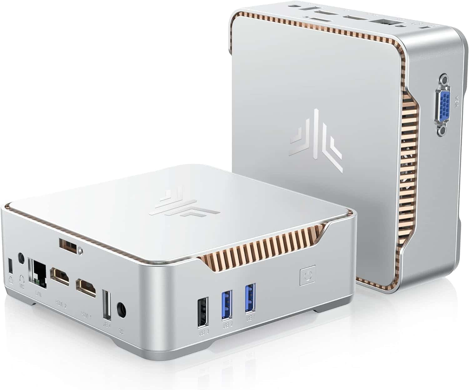 We recently got our hands on the KAMRUI GK3Plus Mini PC and were immediately impressed by its compact footprint. At just 5.1 x 5.1 x 1.96 inches, this little computer takes up minimal desk space while still packing serious performance. The silver case looks sleek and professional in any setting.