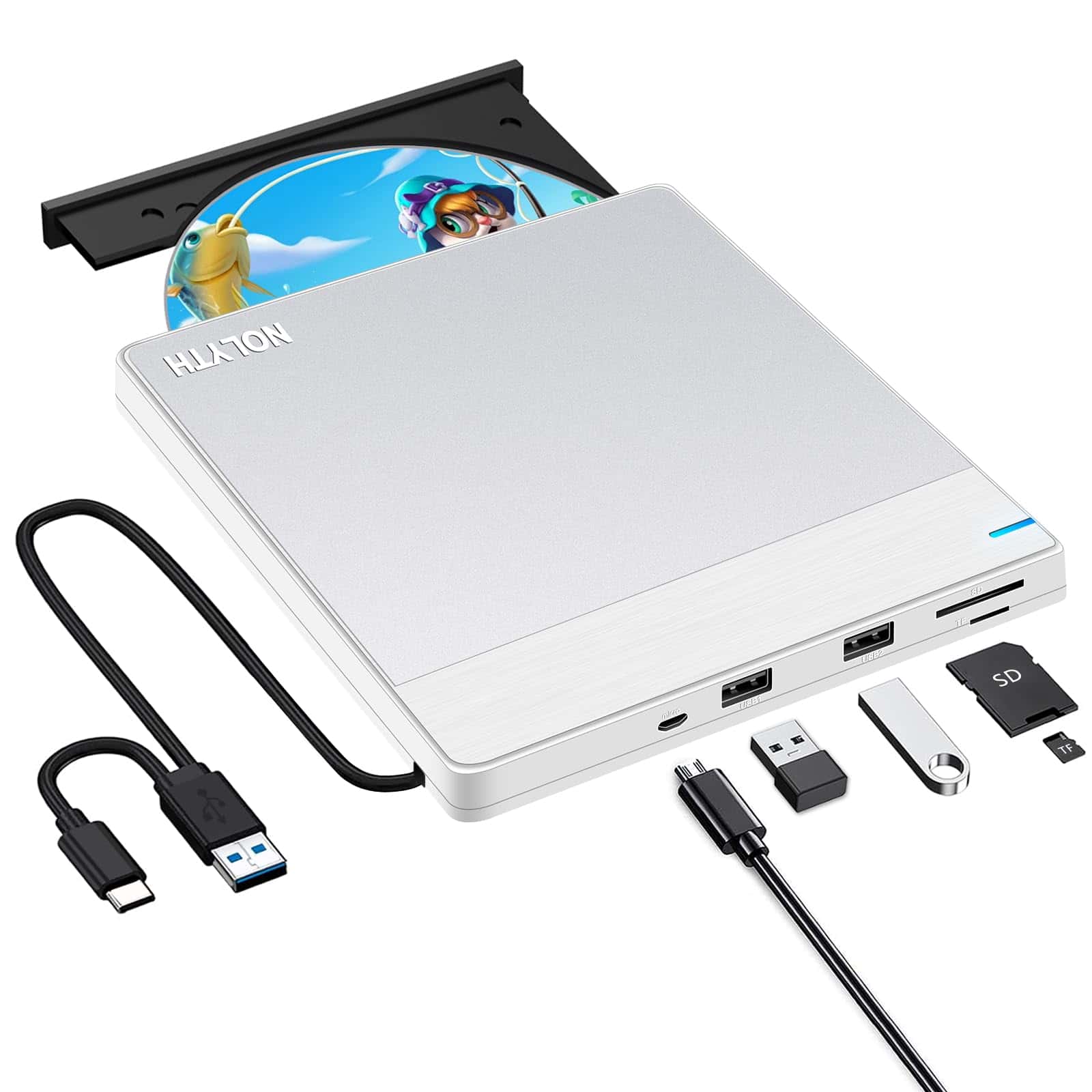 This versatile 8-in-1 external CD/DVD drive solves modern laptop limitations with its multiple USB ports, card readers, and reliable disc burning capabilities.